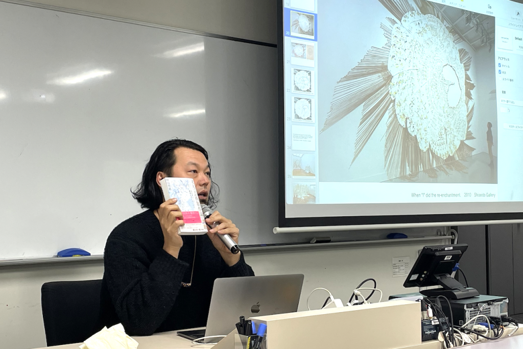 本講義では、村山氏の新著『東大「芸術制作論」講義』(フィルムアート社)にもとづいて、代表作である「織物絵画」の制作プロセスから、AIとの共進化に至るまで、創造性が一部の天才による「閃き」ではなく、意識的なプロセスの設計と技術によって育まれるものであることを解き明かしていただきました。