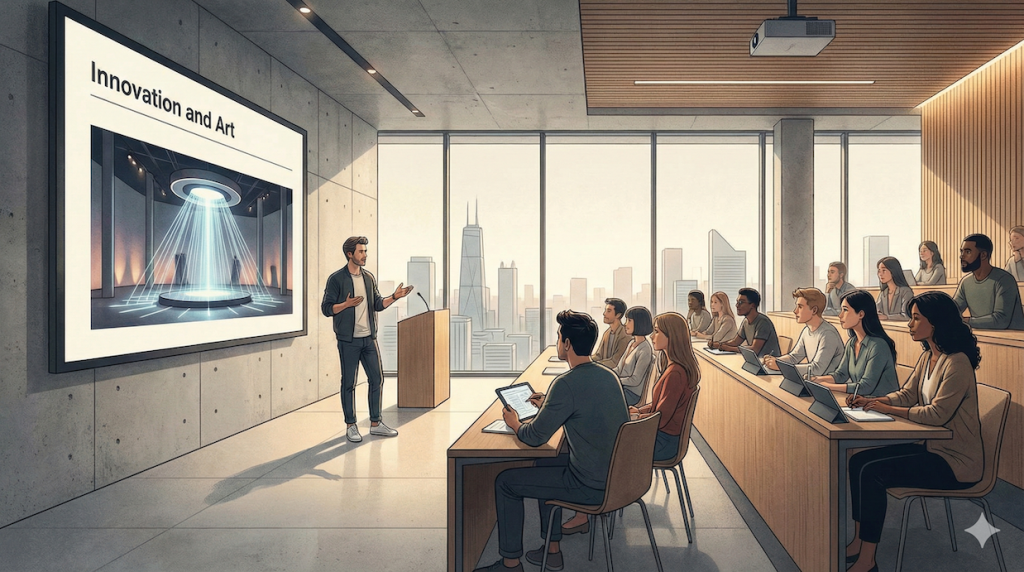 弊社代表の長谷川一英が担当しています、青山学院大学大学院 国際マネジメント研究科「イノベーションとアート」の12月9日(火)の授業において、現代アーティストであり、研究者・教育者としての顔も持つ村山悟郎氏をお招きし、「創造性の源泉を探る」をテーマにご講演いただきました。